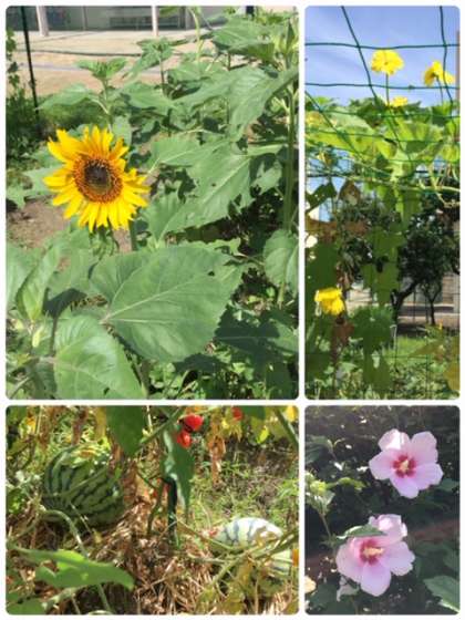 学校が8月まであるので、いつもなら見ることができない、学校のひまわりの花やひょうたんの花も見ることができます。1年生の子どもたちは、アサガオに一生懸命お水をあげています。毎日暑いので、お花たちにも、がんばってもらいたいですね。夏を彩るムクゲの花や、今年はスイカもできています。どこになっているか、わかるかな?