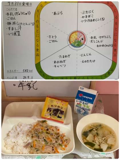 今日の給食は、『豚丼、すまし汁、いり黒豆、ごはん、牛乳』でした。