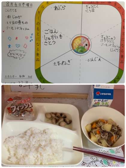 今日の給食は、『肉じゃが、とら豆の煮もの、アーモンドフィッシュ、ごはん、牛乳』でした。