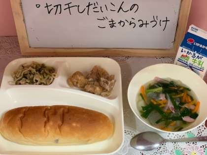 今日の給食は、『鶏肉のからあげ、とうがんの中華スープ、切干しだいこんのごま辛みづけ、おさつパン、牛乳』でした。