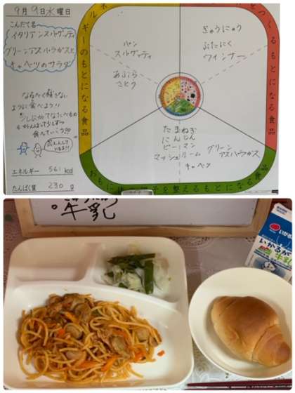 今日の給食は、『イタリアンスパゲッティ、グリーンアスパラガスとキャベツのサラダ、黒糖パン、牛乳』でした。