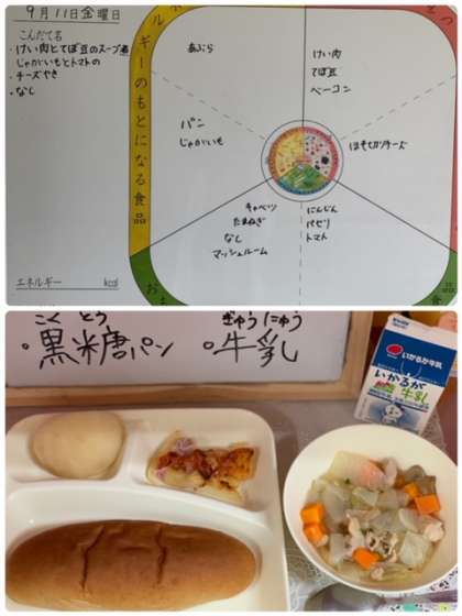 今日の給食は、『鶏肉とてぼ豆のスープ煮、じゃがいもとトマトのチーズ焼き、なし(二十世紀)、黒糖パン、牛乳』でした。