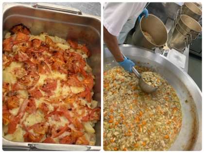 食物繊維と鉄が豊富に含まれているてぼ豆は、児童に摂ってもらいたい食品の1つです。今日は鶏肉・にんじん・たまねぎ・キャベツ・マッシュルーム、青みにパセリを使用した洋風の煮ものに入れることで食べやすく仕上がっています。