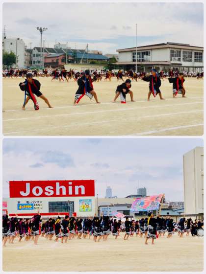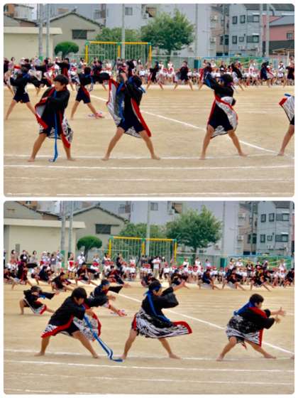 6年生は、いろいろな思いを踊りにこめました。運動場をいっぱいに使い、力強くも滑らかに踊りあげている姿は、荒れた海の大きな波が押しよせてきたかのようでした。