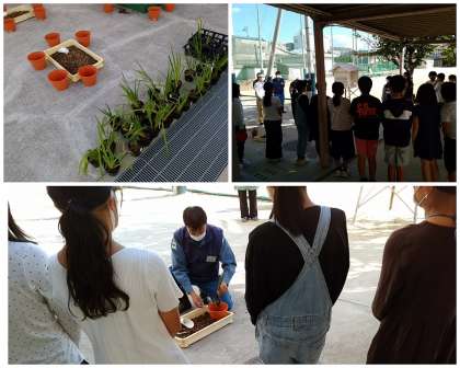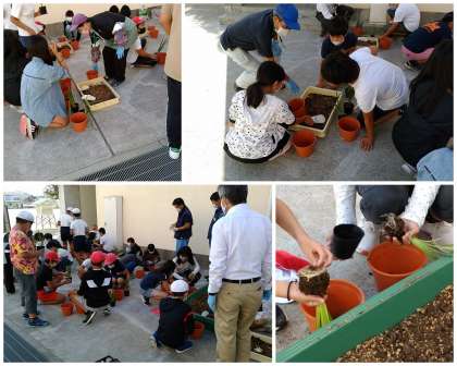 1学期に株分けした花菖蒲を大きな鉢に植え替えました。鶴見緑地公園事務所や旭区役所、地域ボランティアの方々に来ていただきました。栽培委員会の子どもたちも、きっときれいな花を咲かせるのを楽しみに育てていくことだと思います。ありがとうございました。
