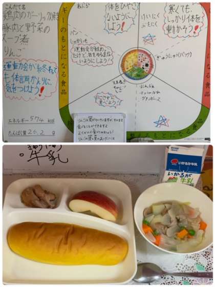 豚肉を主材に、じゃがいも・たまねぎ・キャベツ・にんじん・マッシュルーム、青みにグリンピースを使用した洋風の煮ものでした。