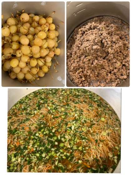 今日の給食ではチンゲンサイ・もやし・にんじんを具材に豚骨スープを使用した汁めんの上に、ひき肉・白ねぎ・しょうが・にんにくを使い、テンメンジャンや赤みそなどで味付けした『肉みそ』をのせていただきました。