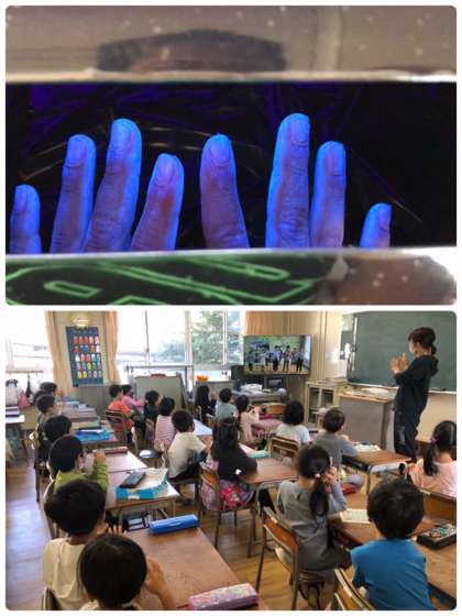 ブラックライトを使用し、水洗いだけでは汚れが取れていないこと、石けんでの丁寧な手洗いが大切なことを伝えます。