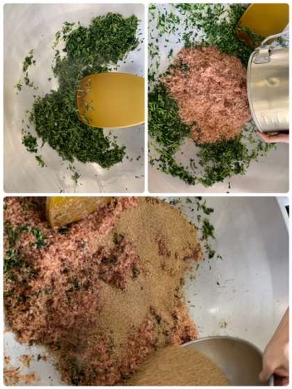 かつおぶしとだいこん葉をいため、みりんとこいくちしょうゆで味付けし、さらにいりごまを加えていためた栄養たっぷりの献立でした。
