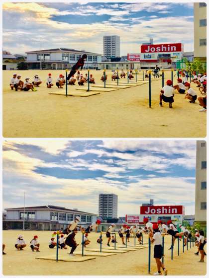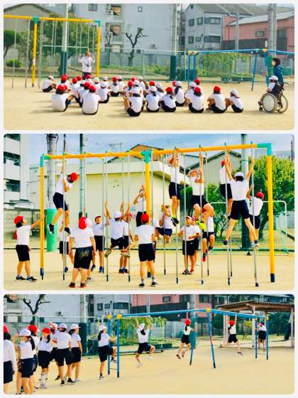 腕の力が弱いということで、まずは、雲梯(うんてい)や登り棒で腕の筋肉を目覚めさせるトレーニング!