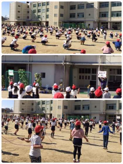 先週から15分休みの時間に、なわとびに取り組んでいます。各学年に合わせた技を、先生が指示を出し、無理のない速さで3分間跳び続けます。
