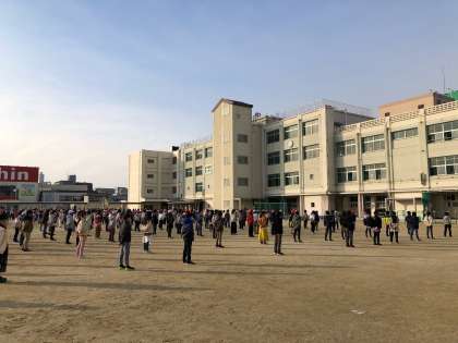 青空のもと、しっかりと間隔をあけて感染対策をしながら始業式をおこないました。