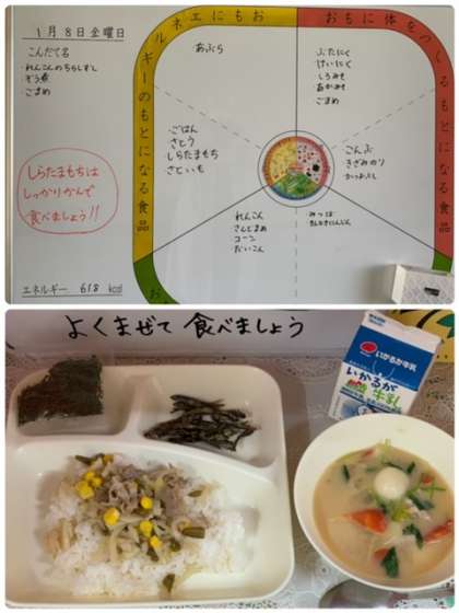 今日の給食には「ぞう煮」と「ごまめ」が登場しました。