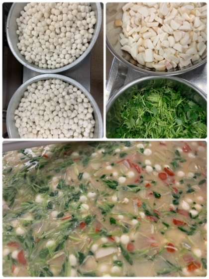 たっぷりのかつお節でとった風味豊かなだしに鶏肉・だいこん・金時にんじん・里芋を加えて煮、白みそを使用し関西風に仕上げています。食べやすいサイズの白玉もちは子どもたちにも大人気でした!青みにみつばを使い、彩り良く仕上げています。