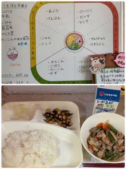 でんぷんをまぶして揚げた大豆にひじきの入った甘辛いタレをからめた、子どもたちにも大変好評な献立です。鉄分や食物繊維を多く含んでいます。