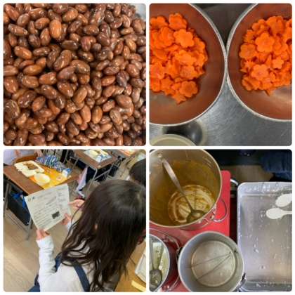 大阪府国産農林水産物学校給食提供事業(※)により今日の給食では近江牛を使用しています。にんじん・たまねぎ・じゃがいもの定番野菜に加えて子どもたちに積極的に摂ってもらいたい食材の1つでもある豆(金時豆)を使っています。今日もたくさんの種類のラッキーにんじんが入っていました。調理員さん、いつもありがとうございます!!