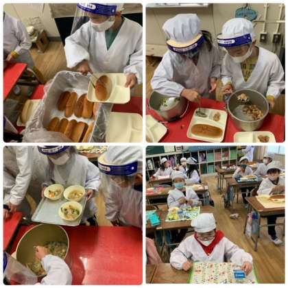〜今日の献立も子どもたちに大好評!!昨日のカレーに続き「今日もめっちゃ美味しかった〜」「食べ過ぎてお腹いっぱい〜」と嬉しい声がたくさん聞こえてきました♪パンと牛乳は少し残ってしまいましたが、おかずは残食なしでした。写真2枚目は1年2組さん、3枚目は5年2組の給食委員会の児童の様子です。