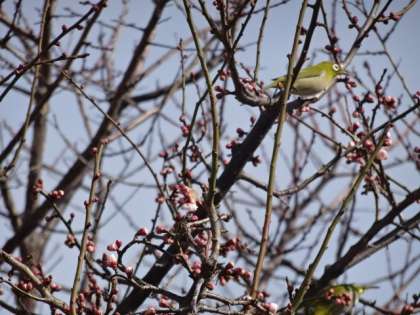 上の写真はうめの木ですが、よく探してみるとメジロが止まっています!