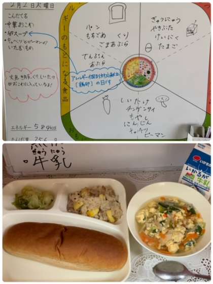 もち米に焼き豚・くり(水煮缶)・しいたけを入れ、料理酒・塩こしょう・こいくちしょうゆ・チキンブイヨン・ごま油を合わせた調味液を加えて、焼き物機で蒸し焼きにした献立です。最初はもっちりとした食感に驚く児童もいましたが、その美味しさに気付き(笑)見事完食!!でした(^^♪