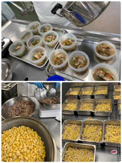 鶏肉・にんじん・もやし・チンゲンサイを具材にしています。溶き卵を流しいれる直前にアレルギーのある児童の分を1人分ずつ容器に取り分けます。調理員さんがいつも以上に細心の注意を払って作業を行っていました。