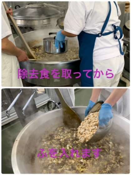 牛肉・はくさい・白ねぎ・まいたけ・とうふ・糸こんにゃく・ふを使用した子どもたちにも大人気の献立です。【ふ】の個別対応献立となっていますので、ふを入れる直前に除去食を取りわけて、対象の児童に提供しています。今日の牛肉も『近江牛』を使用しています。