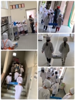 重たい食器かごや大おかずも落とさないよう小さな手でしっかり持ち、教室まで運びました。給食時間が始まるとみんなとても静かで、食べる早さは個人差あるものの、ほとんどの児童が完食していました。