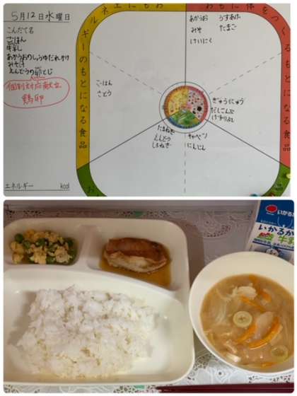 1人分ずつ計量し専用容器に入れた後、クラスと名前の書いた食札をつけて提供しました。