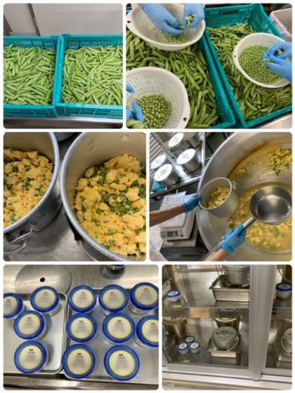 旬のさや付き約14kgのえんどうを、給食室で1つ1つむいて中から豆を取り出して使いました。