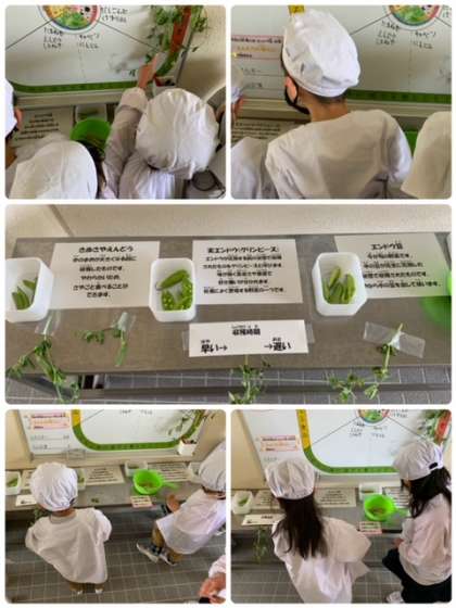 えんどうを完熟するまでの早い段階で収穫すると『グリンピース』、それよりも早いと『きぬさや』と呼ぶんだよと話すと、みんなとても驚いた様子で真剣に見入っていました^^