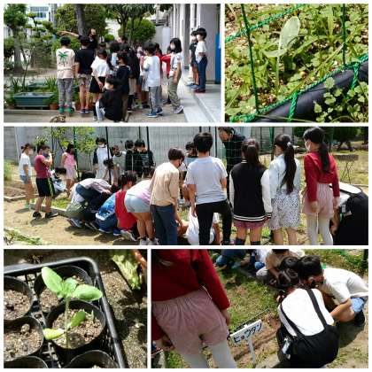 4年生が理科の学習をしています。へちまやひょうたんなど学習に出てくる植物が芽吹いてきたのを観察していました。元気に大きく成長してもらいたいですね。