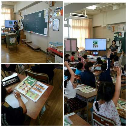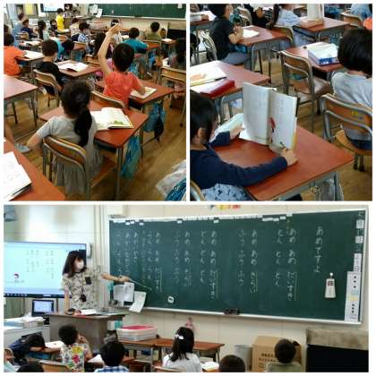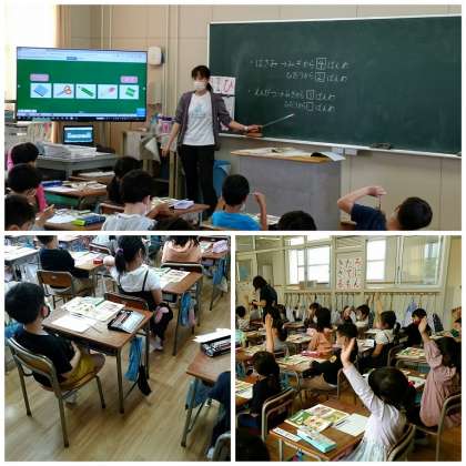 1年生は、1組・2組が算数科、3組は国語科の学習でした。算数科は「なんばんめ?」という順序を数える単元です。国語科は「あめですよ」という詩をみんなで音読していました。