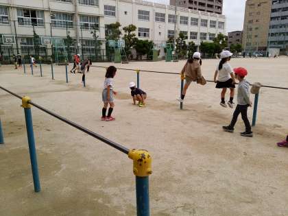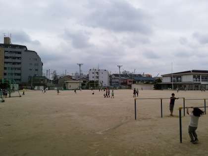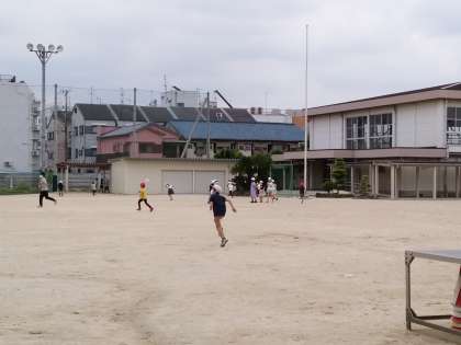今日の休み時間の様子です。梅雨空の合間、子どもたちが運動場に元気に飛びだしてきました。
