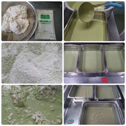 主原料となる上新粉(お米の粉)・白いんげん・まっ茶粉末・砂糖・水をよく混ぜ合わせ、焼き物機で30分間蒸します。