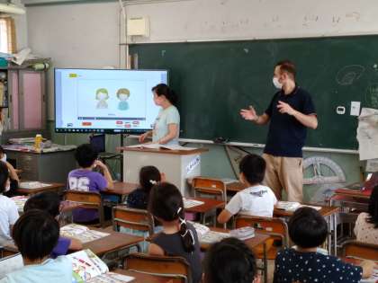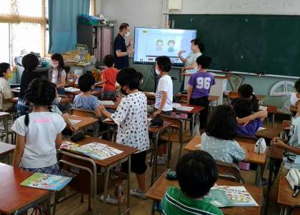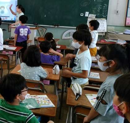 外国語活動の様子です。出会ったときの「Hallo!」を使ったあいさつを、ジェスチャーをつけて、リズムに合わせて言うことで、楽しんで覚えることができていました。