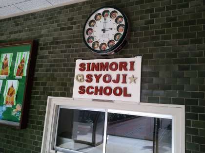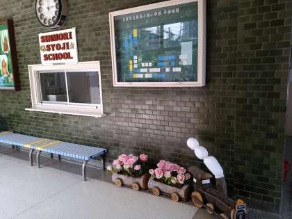玄関に、少し前に剪定した桜の木の廃材を使った、かわいらしい汽車のオブジェと、端材を利用した校名のパネルを、管理作業員さんが作ってくれました。ほっとする空間になればいいな、と思っています。
