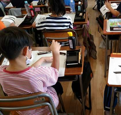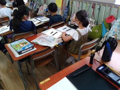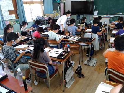 毛筆の学習をしています。3年生から始まる学習です。筆の持ち方、硯の置き方や使い方など細かいところまで気を配って習字に取り組んでいました。