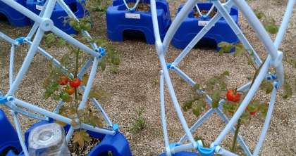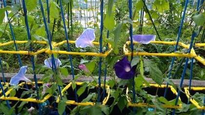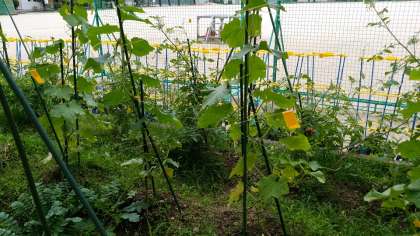 1年生の育てているアサガオが花を咲かせたり、2年生の育てているミニトマトが色づいたりするなど、学校で育てている植物たちが順調に成長しています。