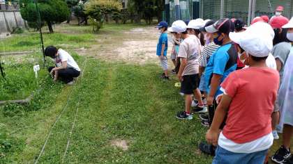 3年生が学習園で、植物がどのように育っていくのかについて学習していました。葉っぱの枚数が増えたり、茎が太くなっていったりしていることに気づいていました。
