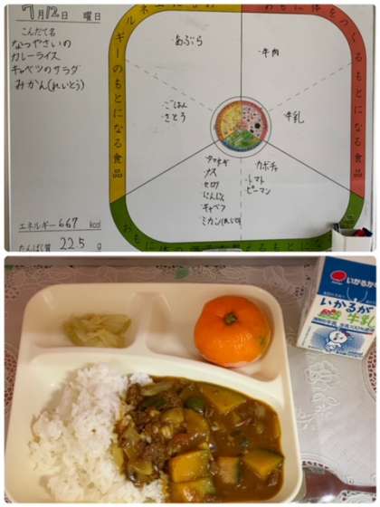 夏野菜のかぼちゃ・ピーマン・なす・トマト(缶)などをたっぷり使った、夏を感じることのできる献立です。カレーライスに入れることで、野菜の苦手な児童もしっかりと食べることができました。