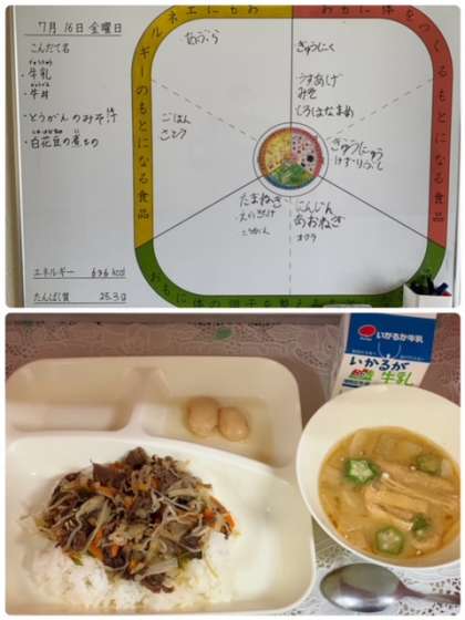 牛肉を主材に、糸こんにゃく・たまねぎ・にんじん・青ねぎ・えのきたけを使用し甘辛く味付けした、子どもたちに大変人気のある献立です。