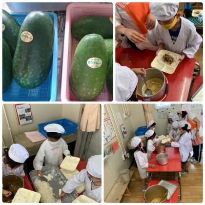 今日、新森小路小学校では和歌山県産の大きくて立派なとうがんを7玉使用しました(およそ28kg)