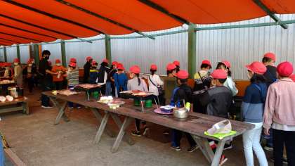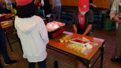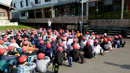 1日目の夕食はバーベキューです。宿舎の方の説明を聞いて、みんなで協力して準備を進めています。