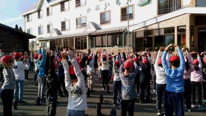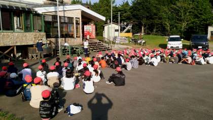 おはようございます。林間学習の2日目が始まりました。朝会で今日の予定を確認したり、体操で身体を目覚めさせたりしました。