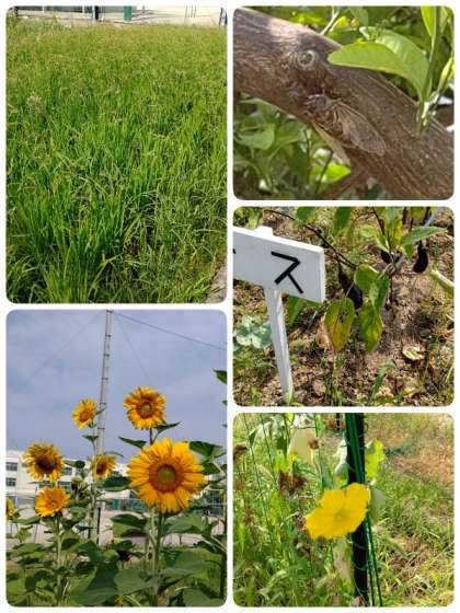 2m近くまで高くなったひまわり、5年生の米作りの稲、4年生のヘチマなど学習園では植物たちが太陽の日差しをたっぷり浴びて、成長しています。