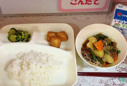 牛肉とじゃがいもを主材に、にんじん・たまねぎ・糸こんにゃくなどを使い甘辛く仕上げた、子どもたちにも大変好評な献立です。