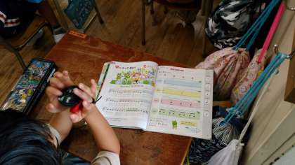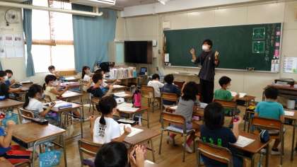 2年生の音楽の学習です。カスタネットを使ってリズムをとる練習です。先生の真似をして打ったり、みんなでそろって打ったりしていました。