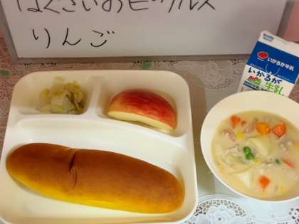 鶏肉・ベーコン・にんじん・たまねぎ・じゃがいも・コーン・グリンピースを具材に、小麦アレルギーの児童も食べることができるよう米粉(上新粉)を使い仕上げた、見た目にも鮮やかなシチューです。スイートコーン缶を使うことで、よりコーンの甘みと風味が増し美味しく仕上がっています。もちろん、子どもたちにも大好評でした^^