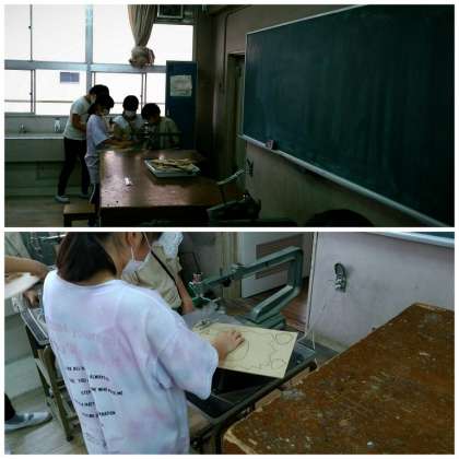 5年生が、図画工作科の学習で、ホワイトボードを作っていました。好きな絵を描いて、電動のこぎりで切って出来上がったものにマグネットシートを貼るそうです。友だちと協力して電動のこぎりの扱いに注意しながら、慎重に作業を進めていました。