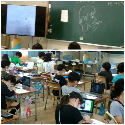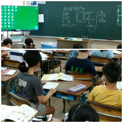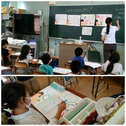 2年生の学習の様子です。1組では、生活科のおもちゃづくり、2・3組では、図画工作科で水彩絵の具の使い方をに取り組んでいます。おもちゃづくりは、ペンギンやウサギなどの動物の絵をかいてそれが木登りしているおもちゃをつくるそうです。図画工作科で、水彩絵の具に水をしっかりと混ぜ透明感のある色でシャボン玉を塗っていきます。シャボン玉を膨らませている自分の顔もパスでしっかりと描きます。