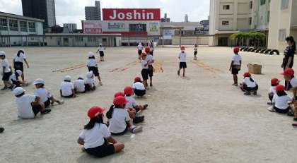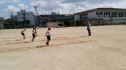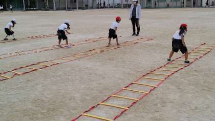 1年生が体育科の学習でラダートレーニングに取り組んでいました。ラダートレーニングとはラダーというハシゴのようなトレーニング器具を使用し、いろんなステップを踏むことで瞬発力やバランス感覚、体を巧みに動かす力などを高める運動です。1年生は簡単なステップから始めています。楽しそうにいろいろなステップをリズムよく踏んでいました。